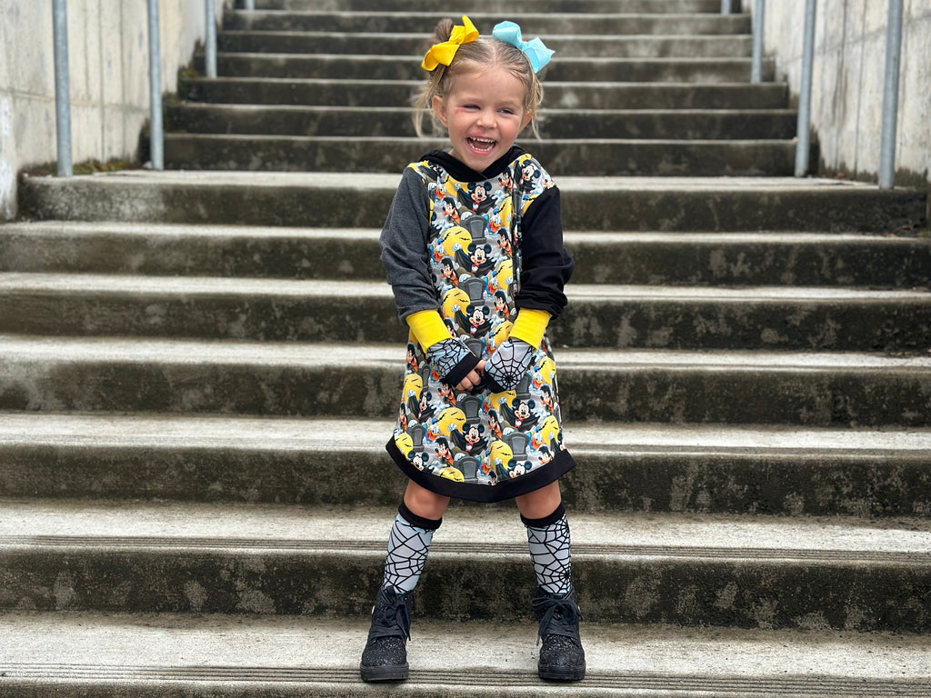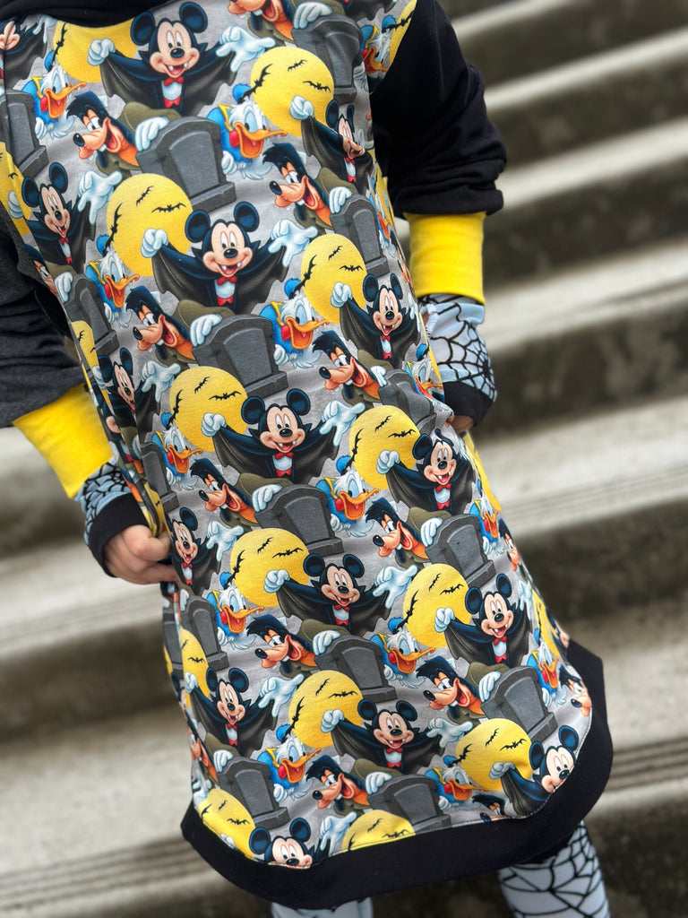 Kids Hoodie with Mickey,Goofy and the Gang. Mouse ears on the hoodie make this extra fun for Halloween Choose dress length as shown or regular hoodie. Handmade style in a soft brushed poly print that washed up like a dream.