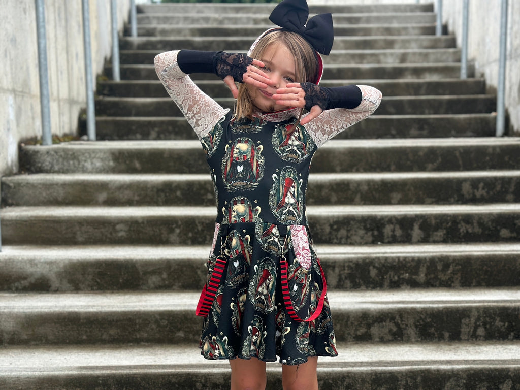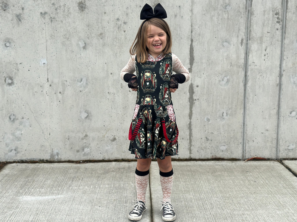 Mr and Mrs Skellington Girls Dress Lace Hoodie Pockets Twirly Skirt Halloween Christmas Red Cream Black Handmade