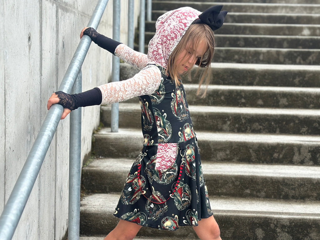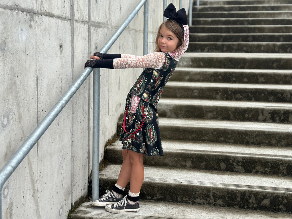 Jack and Sally Dress with Victorian Artwork style fabric has everything girls love! Pockets, twirly skirt, creamy lace hoodie and sleeves. Nightmare Before Christmas fans will adore this girl's dress. Handmade style in a soft brushed poly print that washed up like a dream.