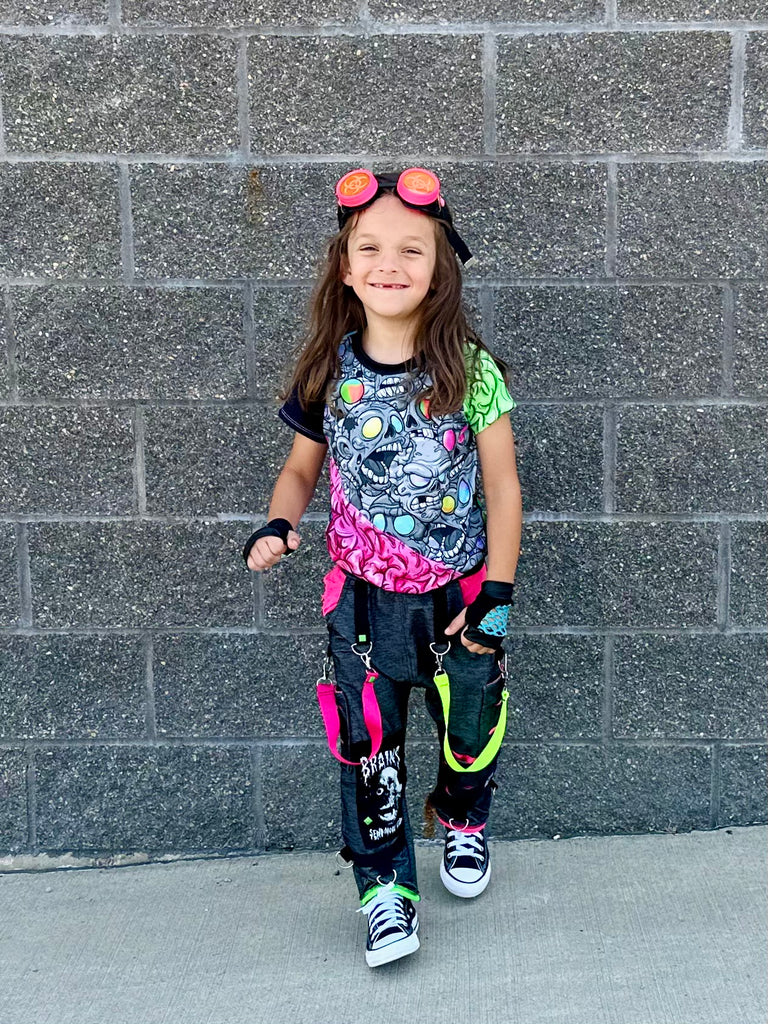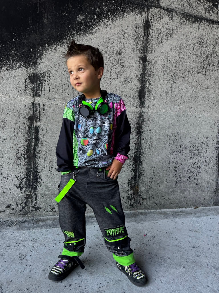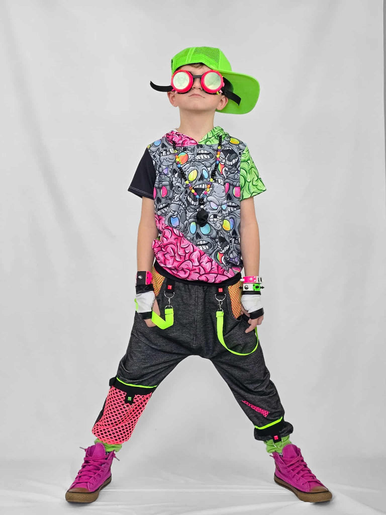 Black Denim pants with baggy street style fit. Pockets in lime and hot pink. Clip on suspender straps. Front slits with optional patch. Hemmed legs can roll up for longer wear. Baggy street style shorts are also an option. These would fall midcalf and no cuff. CHOOSE Mix of pink and green or all of one color.