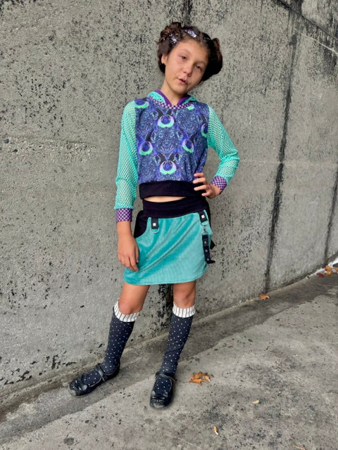 Soft corduroy aqua skirt with pockets. Punky clip on suspender strap add that rebel touch. Also available in BLACK Corduroy fabric . It has washed up great on cold water and dry as usual. It as been prewashed to minimize shrinkage.