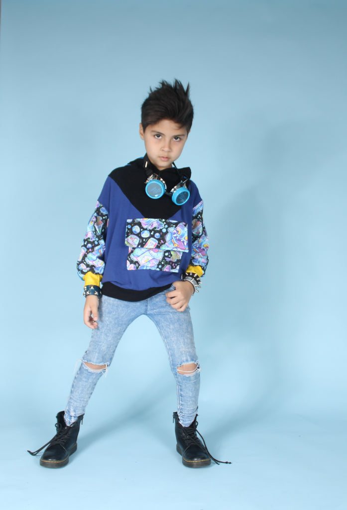 Derpy Hoodie for kids in punk oversized KPop style with colorblock design. Large blue Derby pocket on center front. Lined hoodie available in several color options.