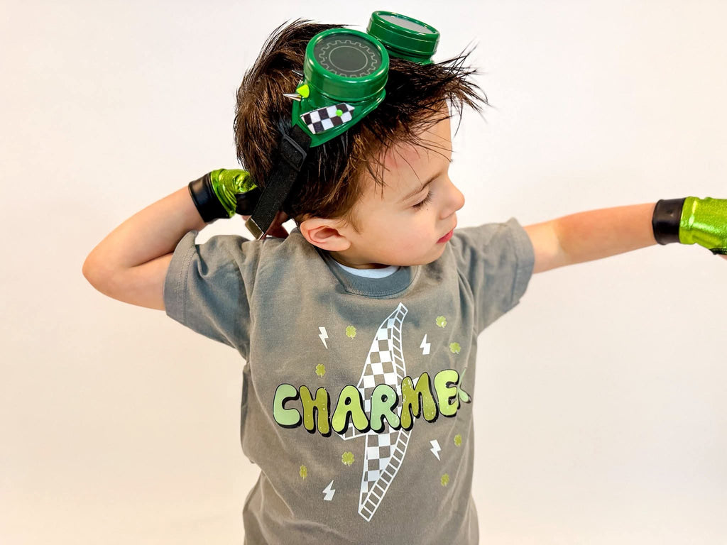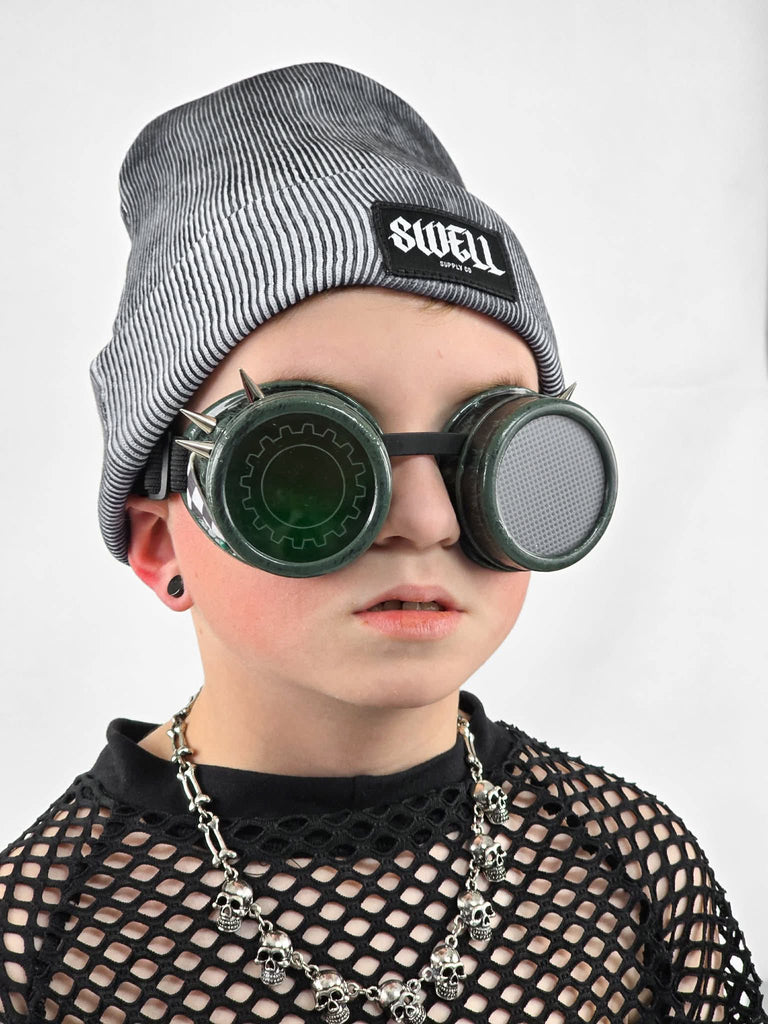 Goggles in green with spikes and matching fingerless gloves with black mesh and pleather cuffs.
