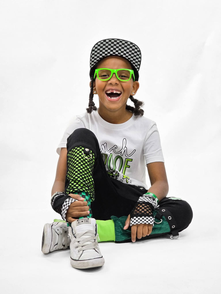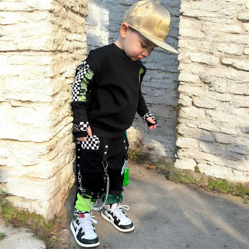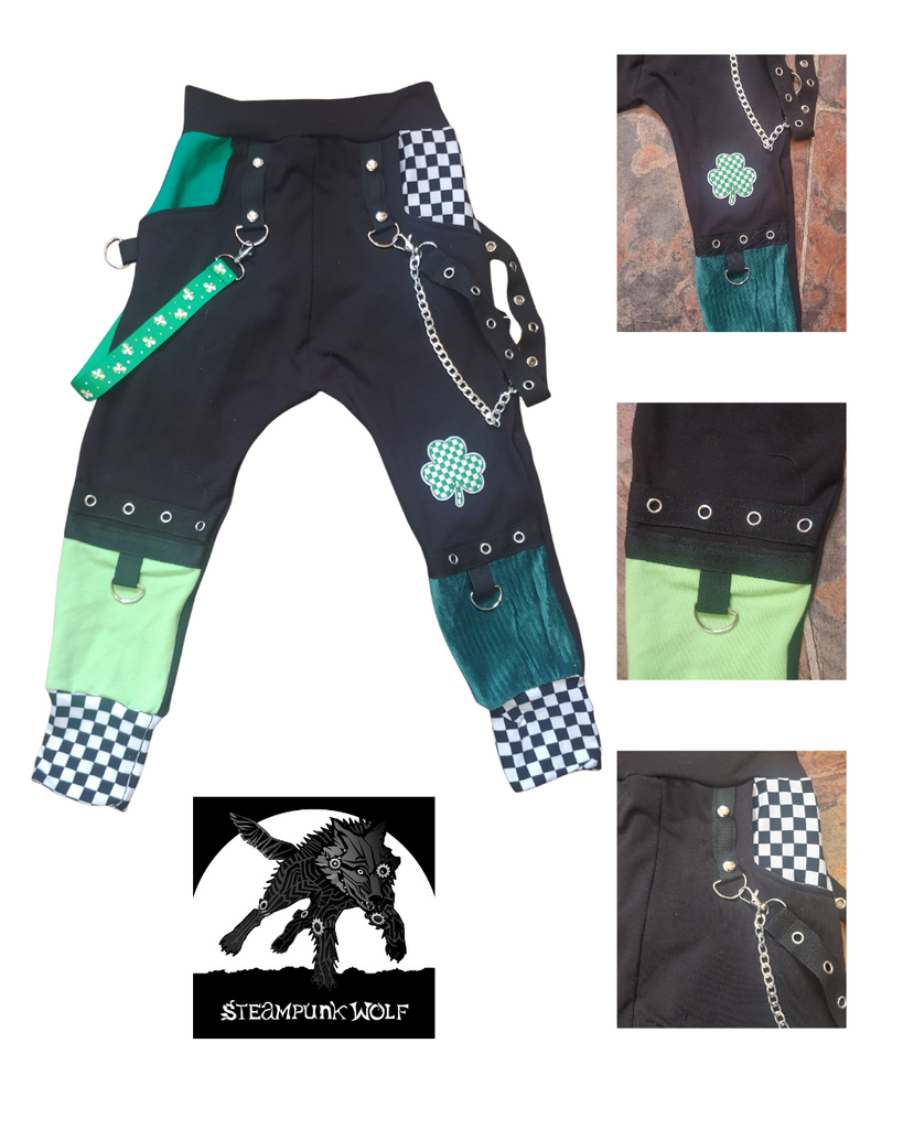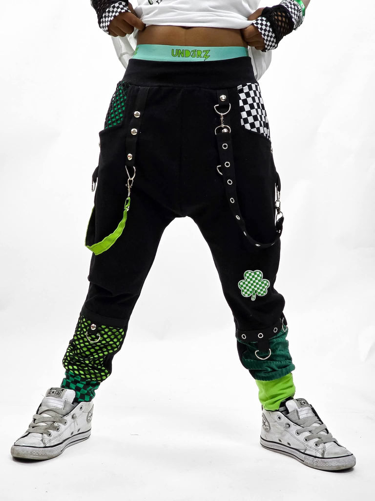 Black kids punk pants in Shamrock themed jogger pants for unisex kids with big pockets lined in checks and Kelly green. Lots of extra details with a Shamrock patch, grommets,trim, metal rings and studs. Punky clip on suspender strap add that rebel touch. Legs are banded in wide checked cuffs.